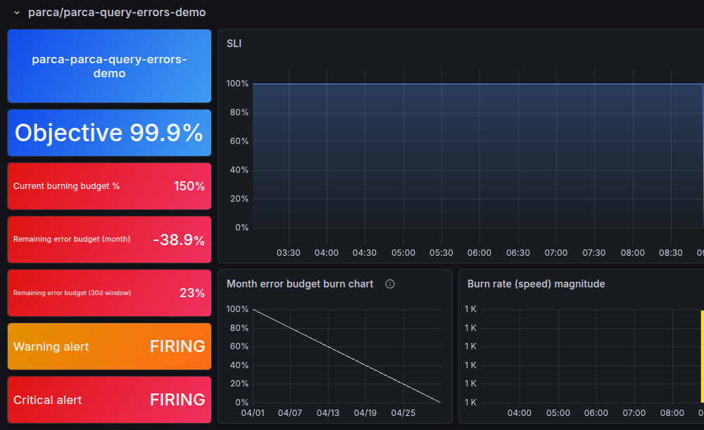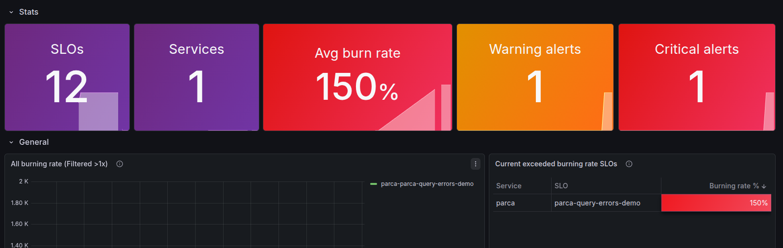 sloth-k8s-operator is a charm that wraps the Sloth SLO generator to convert SLO specs into recording and alerting rules pushed to Prometheus / Mimir. It also comes with a set of predefined Grafana dashboards that help you visualize the objectives and the current state of the system: