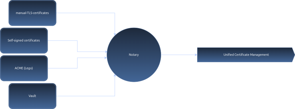 Instead of being tied to the specific implementation details of tools and apps like certbot, Lego/ACME client, Vault, k8s cert-manager or manual .pkx certificates, you adopt a flexible architecture that can adapt to change. Notary will take the fragmented world of all of those tools and combine them into a single, cohesive security strategy.