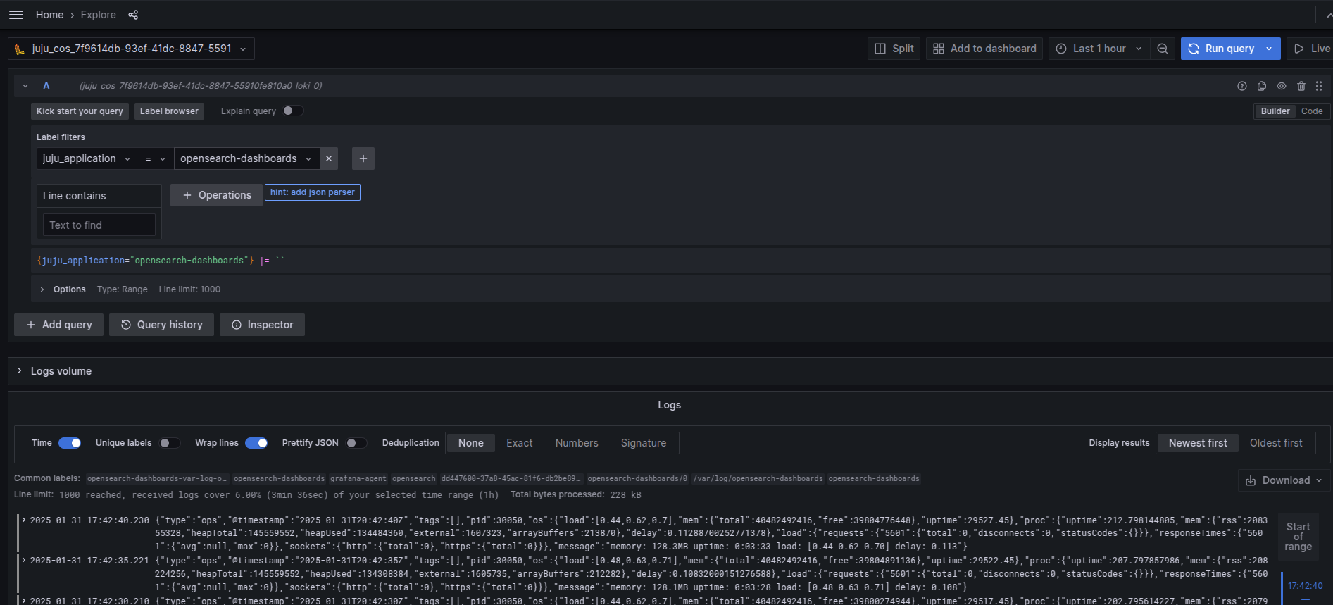 To get OpenSearch Dashboards logs, go to the Label filters field and set to juju_application = opensearch-dashboards, select one operation, e.g. Line contains and run the query.
