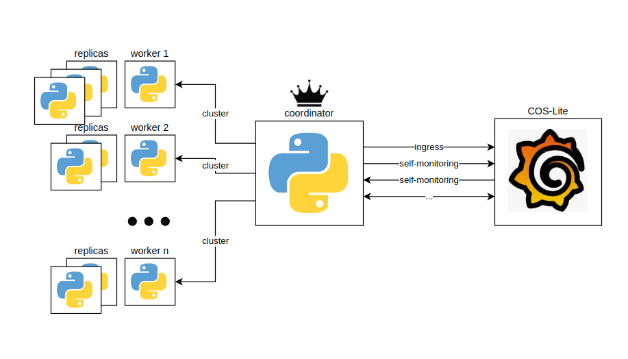 In a nutshell, the coordinator charm acts as single integration point for all relations to and from cos-lite and external charms, while independently-scalable worker applications run the various components of the distributed application.