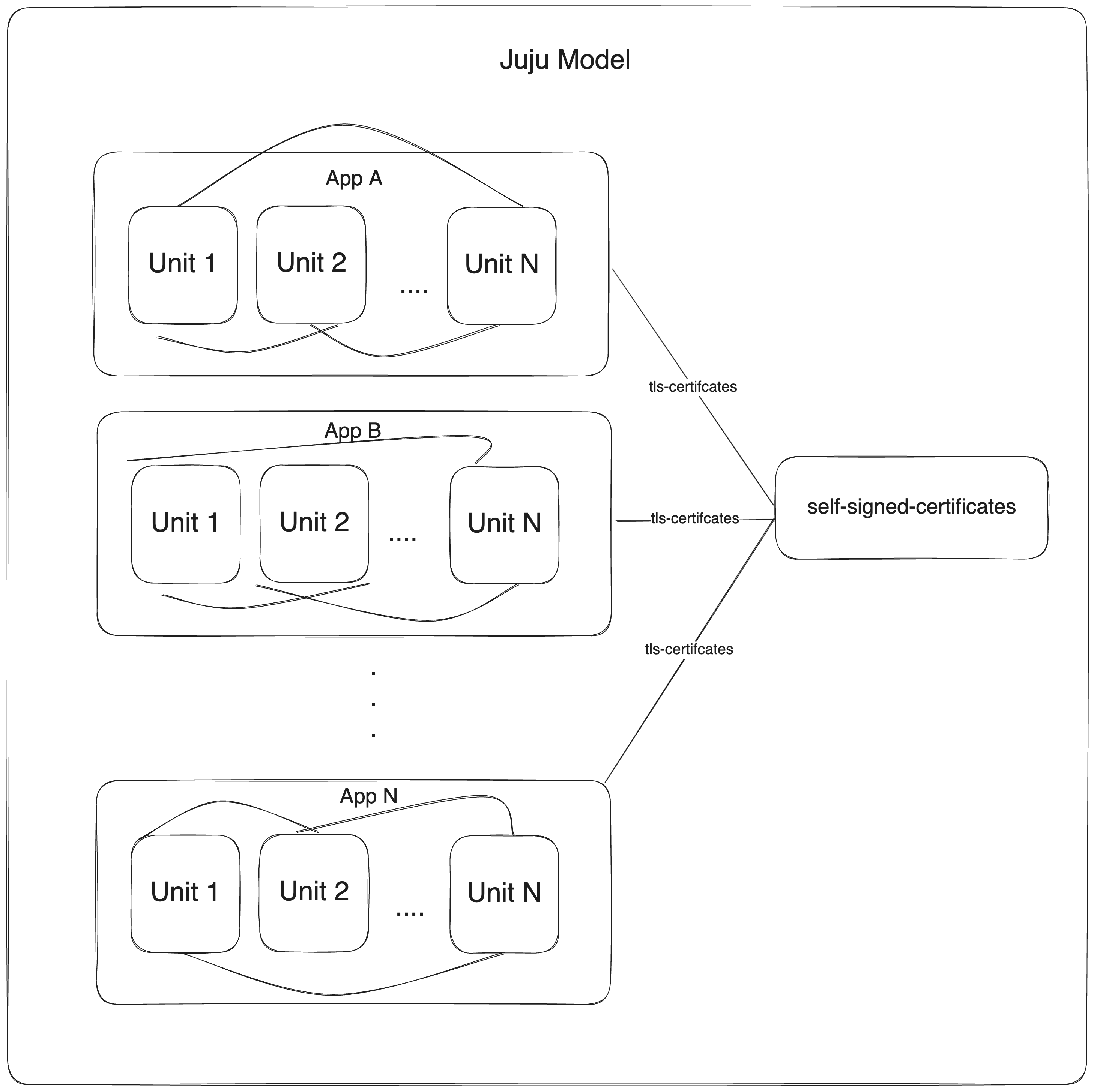 When deploying multiple applications in a Juju model that require TLS for internal communication (e.g., between the units of the same application), we recommend using the self-signed-certificates charm.
