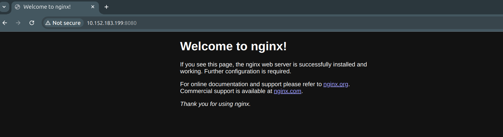 Using your browser, navigate to the application address on port 8080 using the HTTP scheme. Here this would be http://10.152.183.199:8080.