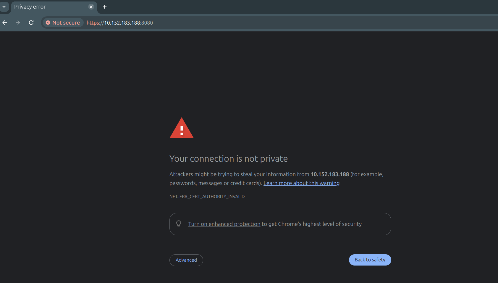 You should see the following page telling you that the HTTPs certificate is not valid: