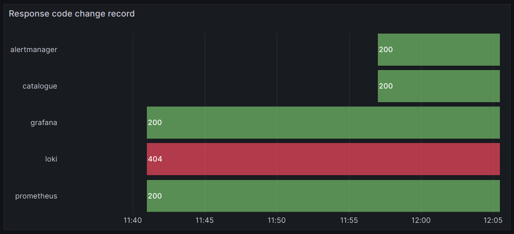 A good way to display HTTP status codes visually can be the State Timeline plugin, which allows to immediately grasp possibly time-related network issues.