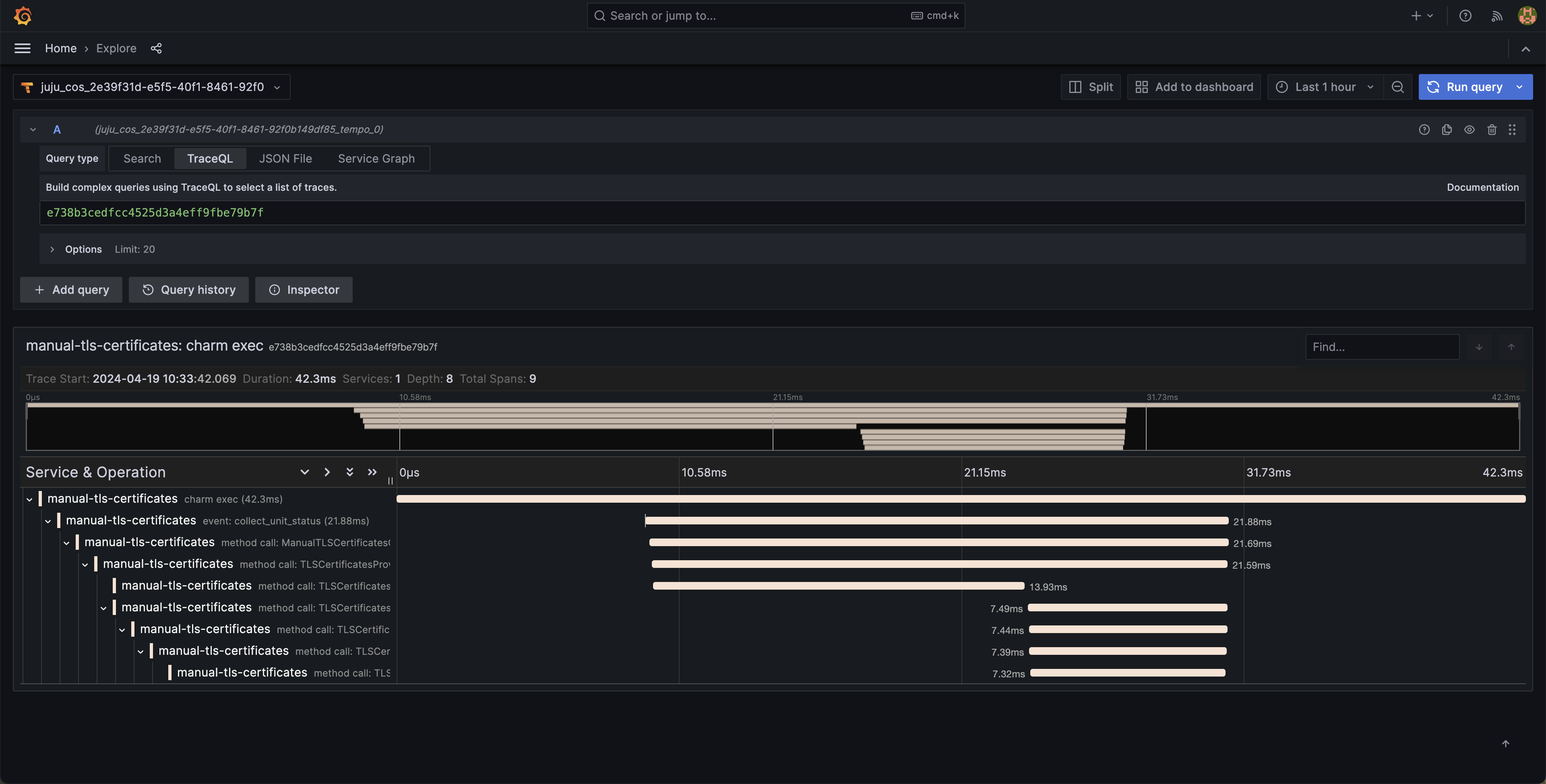 In Grafana, you can now explore charm traces for Manual TLS Certificates using the Tempo data source.
