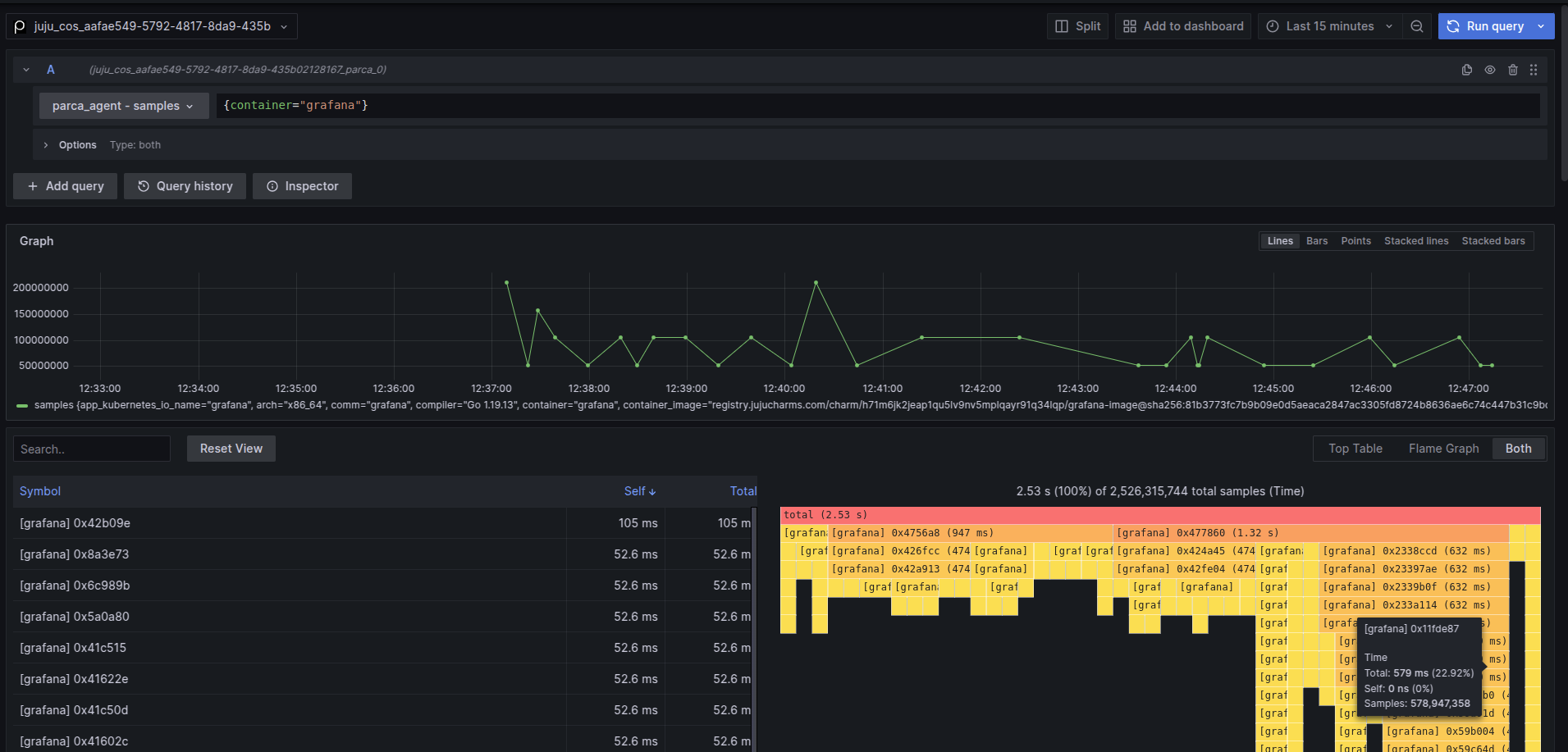 In Grafana’s Explore view, select the Parca datasource and verify there’s parca_agent in the profiles tab. If you deployed COS on the same Kubernetes cluster that is being profiled, you should be able to see profiles from each of the applications that parca can natively instrument: