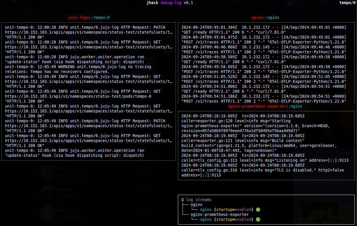 nginx” service in the “nginx-prometheus-exporter” container - at the bottom: a neat little tree overview of the various pebble log streams (and the status of the services that generate them).