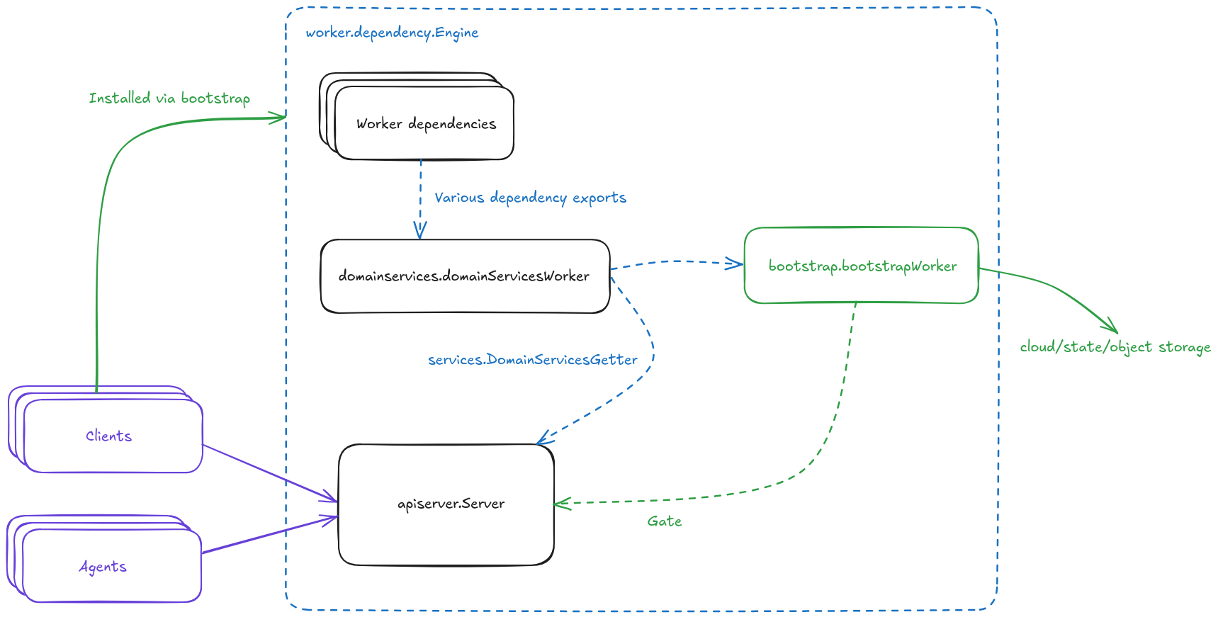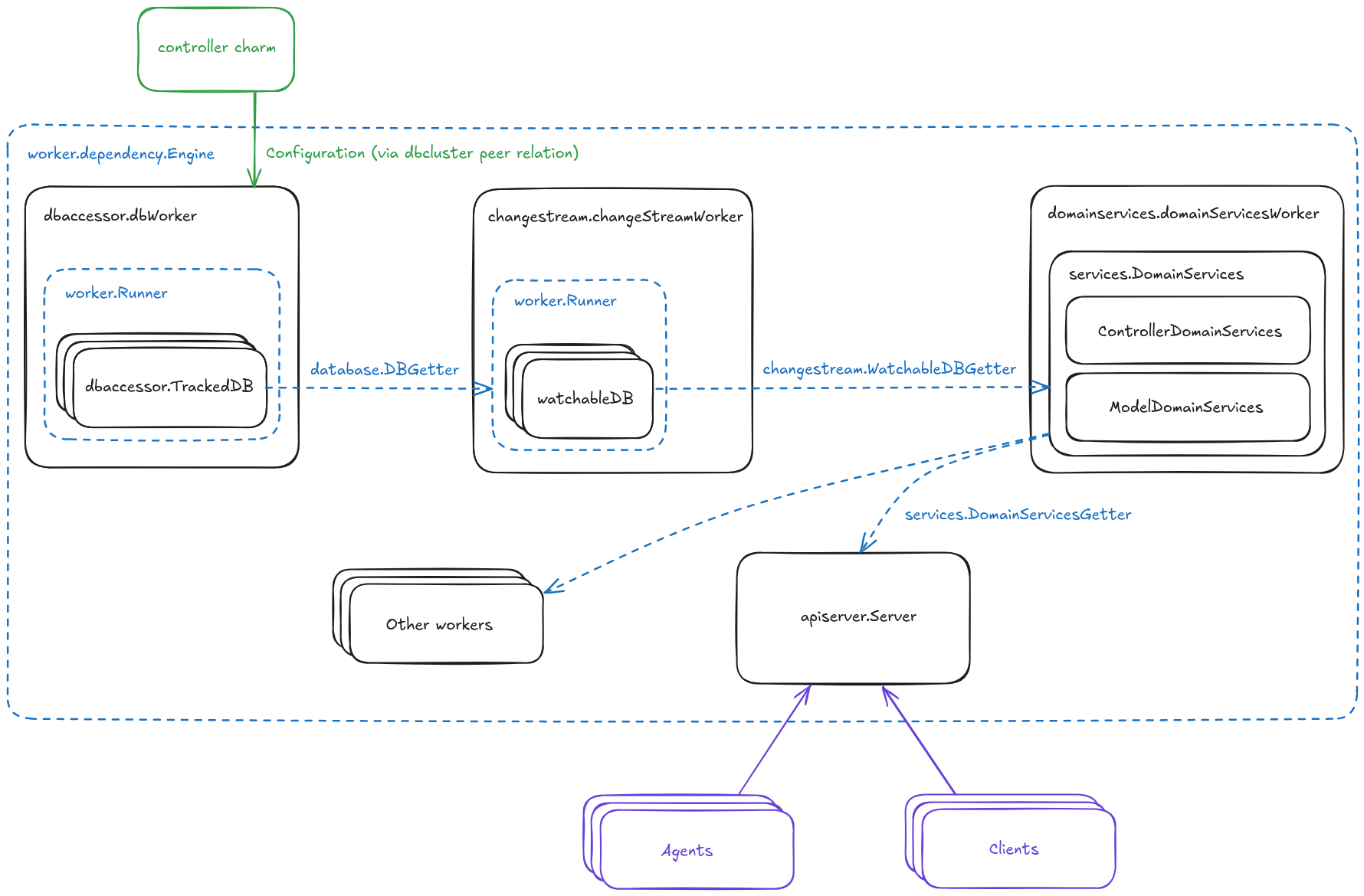 The ultimate consumers of runner/watcher capability are the main Juju domain services. This is where we implement all of our application logic. These services are recruited by the API server in order to serve clients and agents, and by other workers in the controller database.