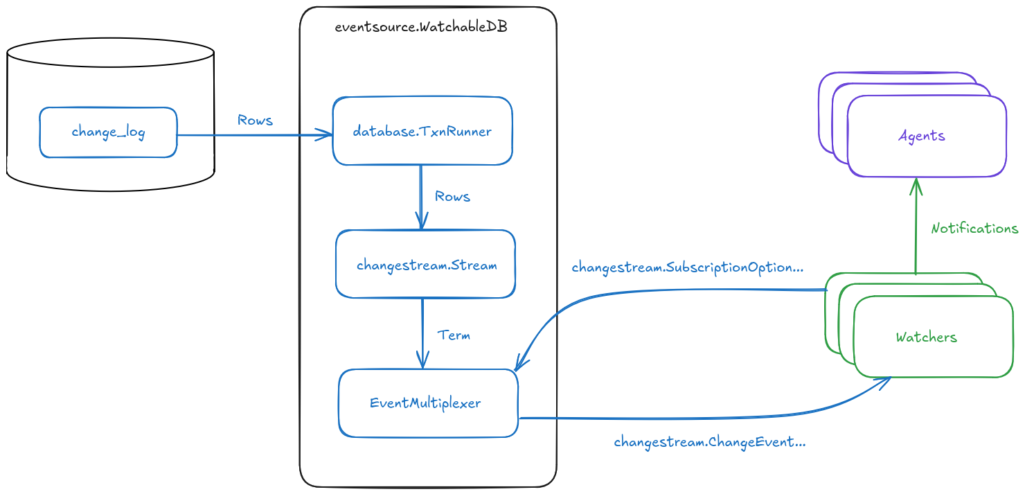 Dqlite does not possess such a mechanism, so the Juju team designed a trigger-based change log, which is read in a loop by the changeStreamWorker. This worker dispatches terms to another worker that manages subscriptions from watchers.