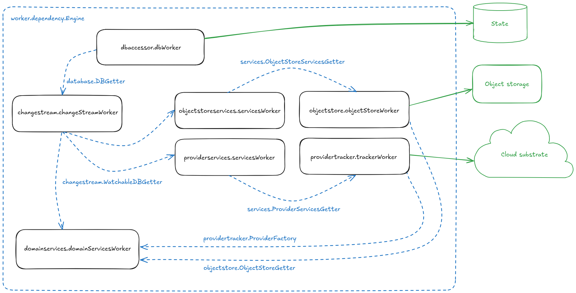 It also maintains a set of trackedDB child workers, one for each database. Juju has a main controller database, plus one for each model. These workers export to other workers, the ability to acquire a transaction runner. Each one monitors the health of its database connection and implements a retry strategy for transactions submitted to the database.