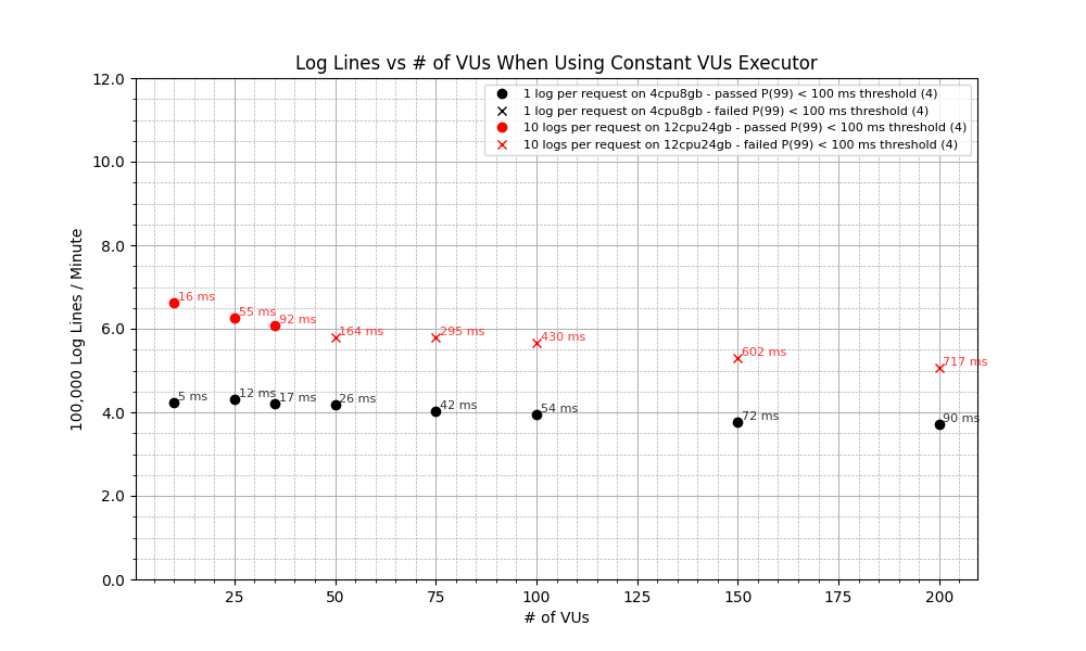 Let’s put our improvements to a quick test. We’ll try again with 5 logs per request on two different machines: one of 4cpu8gb and one of 12cpu24gb. The results speak for themselves: