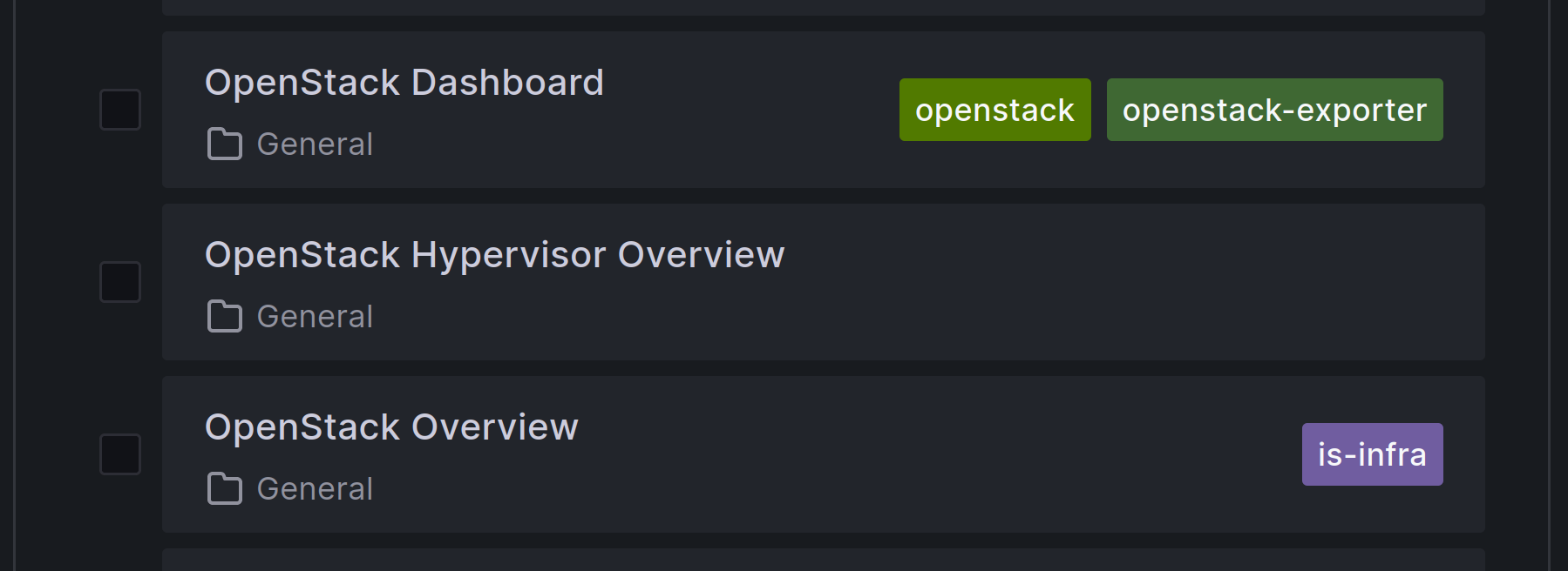 Navigate to the Grafana web ui and click the dashboards tab. Under the “General” folder, you should see the three dashboards:
