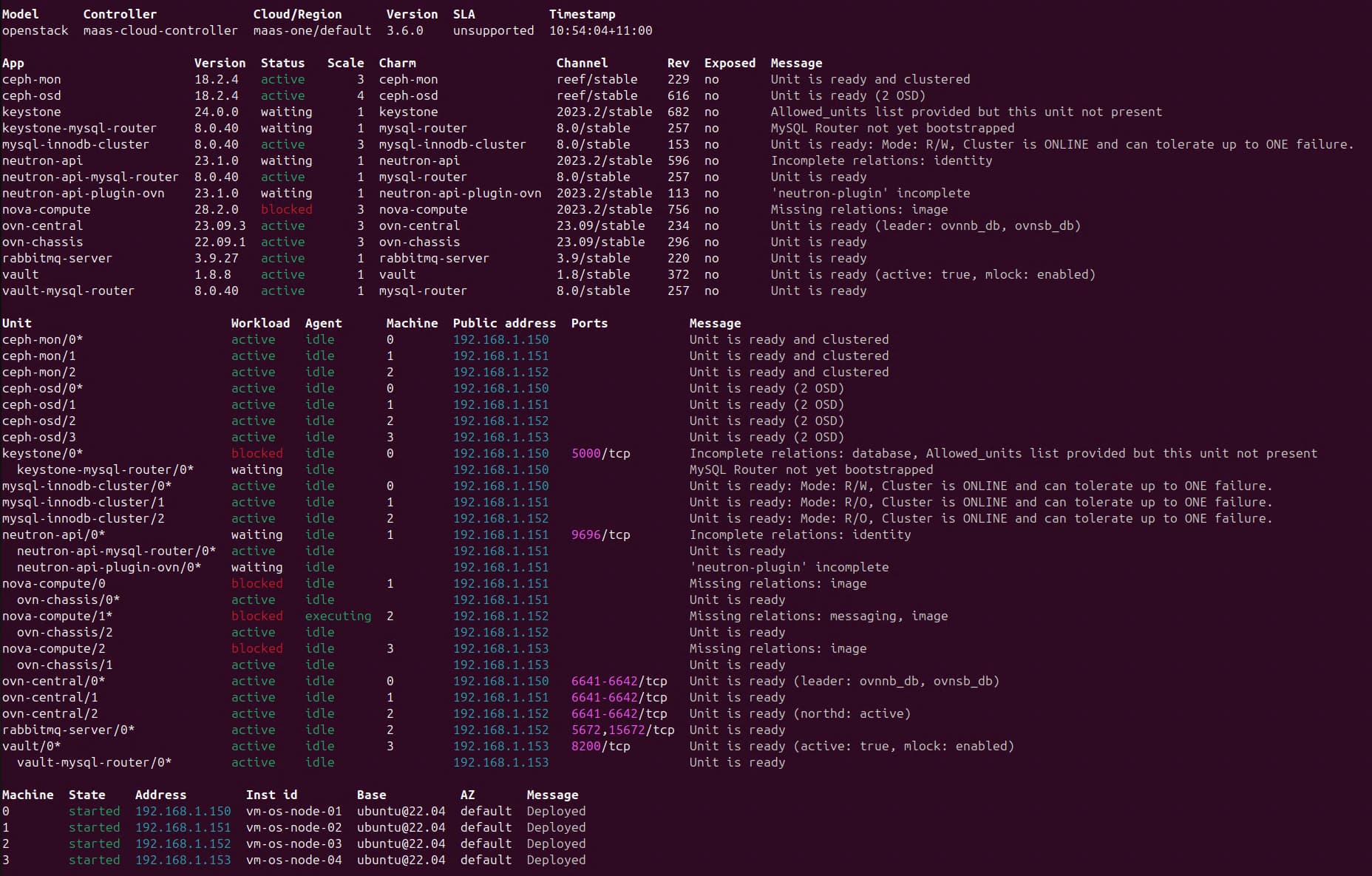 For now, I’ve just completed the RabbitMQ step (as explained here: https://docs.openstack.org/project-deploy-guide/charm-deployment-guide/latest/install-openstack.html) which is a stop-and-check point. When checking, the following status is shown: