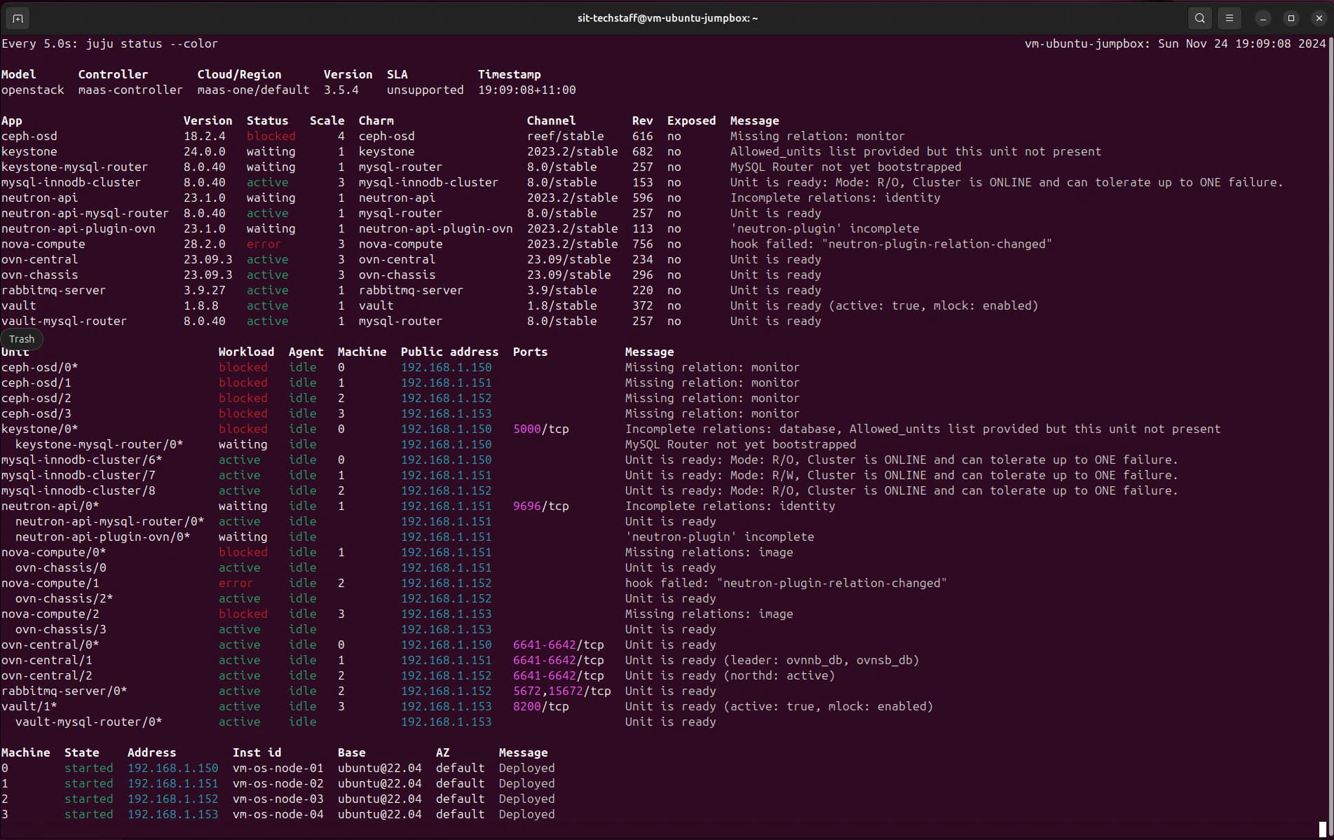 First-time juju user, and thought I might attempt a Charmed Openstack install - because throwing myself in the deep-end is always fun (and having an Openstack private cloud would be most useful right now). For this case, I’ve tried to follow the guide: https://docs.openstack.org/charm-guide/latest/index.html … as close as possible, although there is some variation in operating environment (later …)