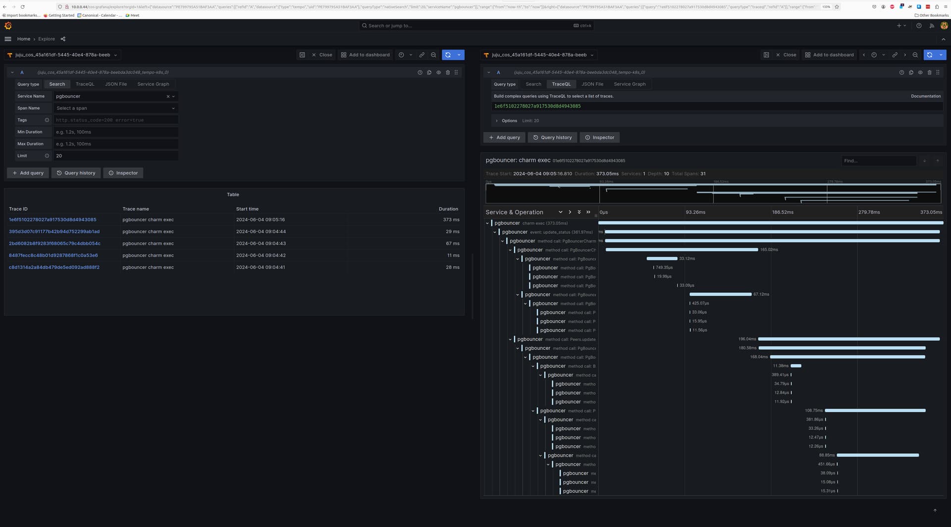 After this is complete, the Tempo traces will be accessible from Grafana under the Explore section with tempo-k8s as the data source. You will be able to select pgbouncer as the Service Name under the Search tab to view traces belonging to Charmed PgBouncer.