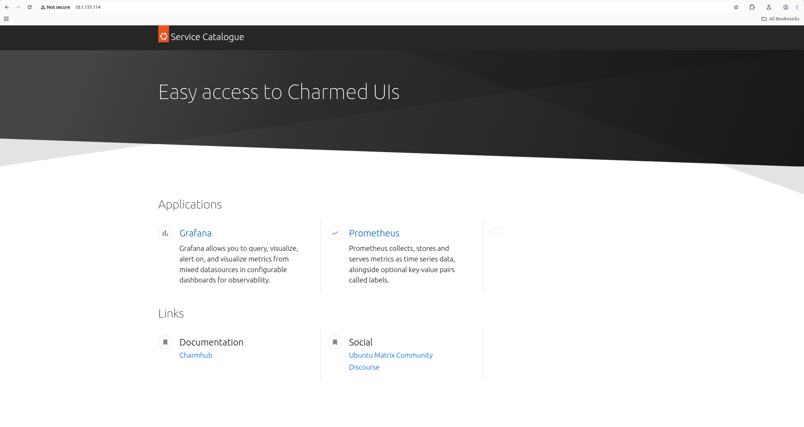 The Catalogue K8s charm deploys a simple UI built with Vanilla Framework, allowing solution authors to include a “starting page” that links to all of the UIs available in the solution. The actual workload is something I put together myself to be included in COS, but the charm lends itself to inclusion in any solution.
