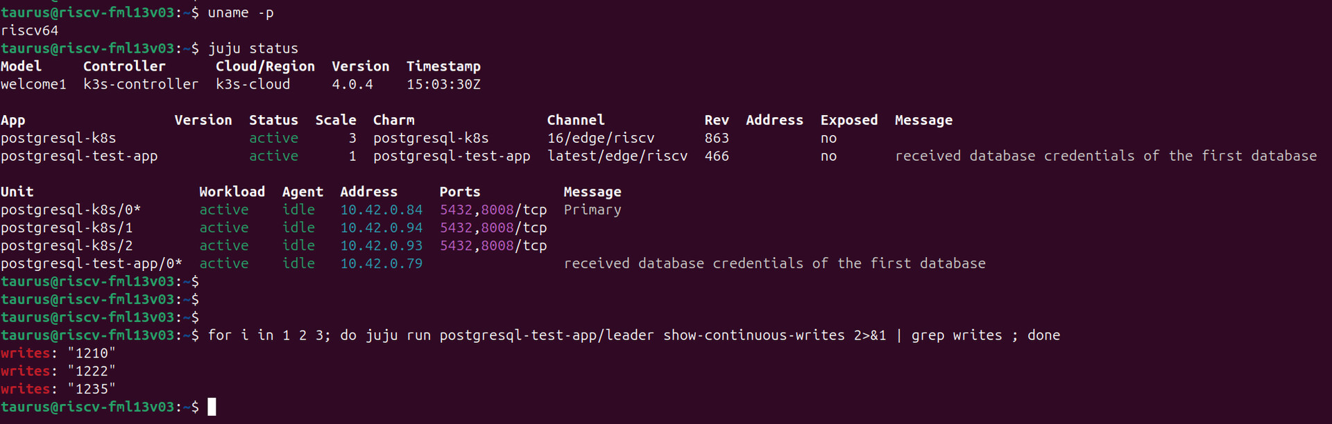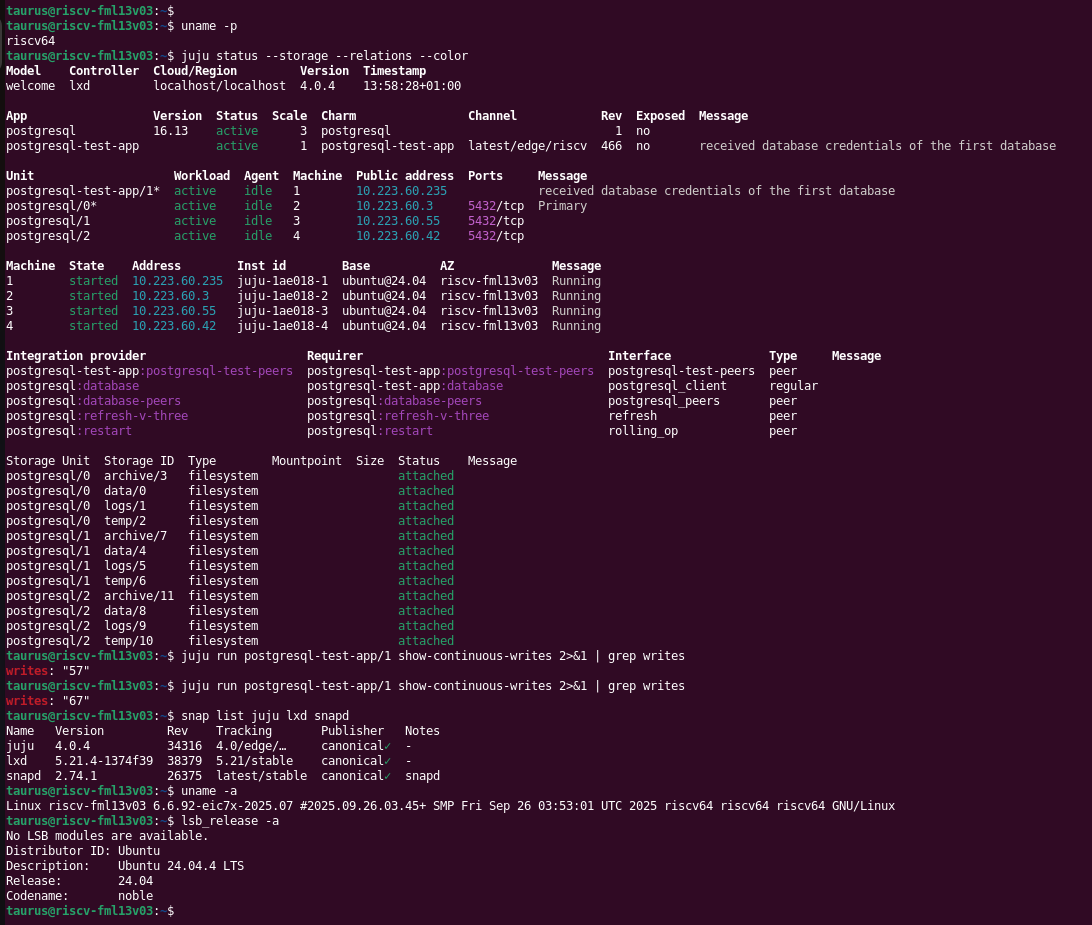 This single command leverages the postgresql Charm, fetching a RISC-V compatible version from the specified channel and handling the provisioning and deployment (Day-1 operations). Charmed PostgreSQL VM deployment example on RISC-V: