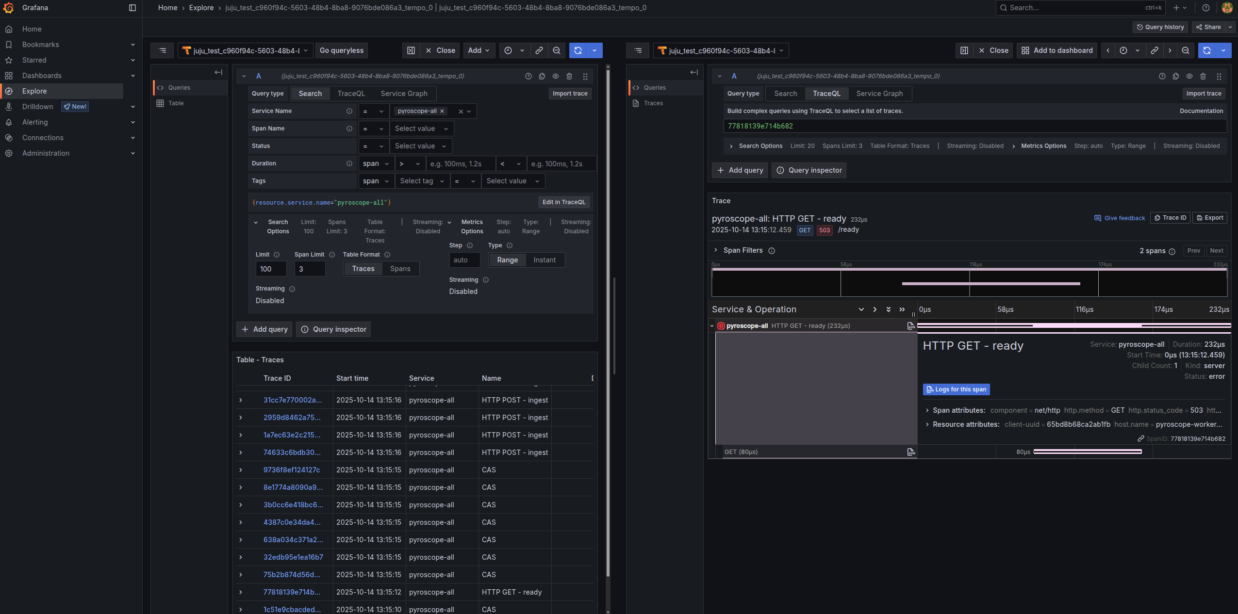 To leverage this feature, we’ll need charmed tempo HA and charmed loki HA to handle the correlation between traces and logs, and charmed grafana to provide the user interface where this correlation can be explored.